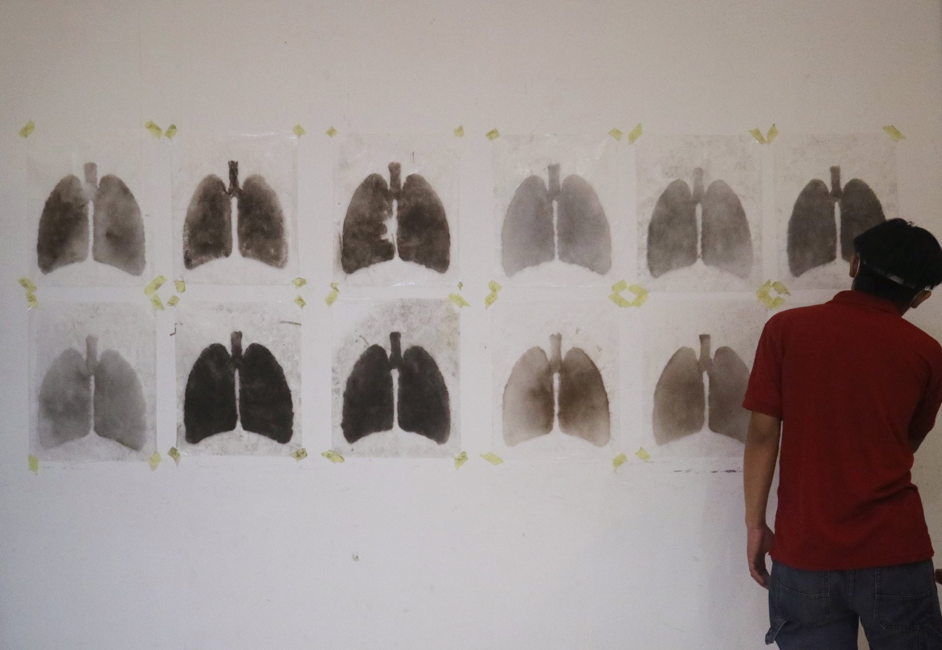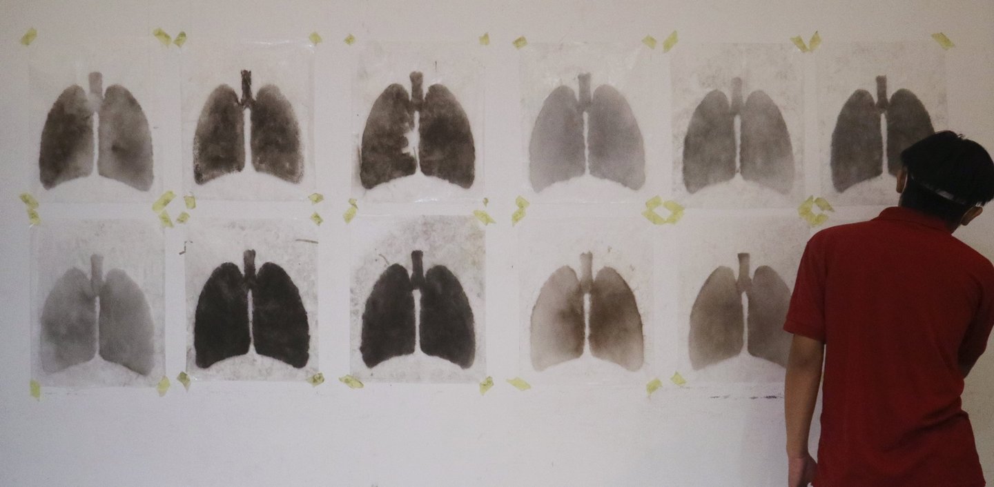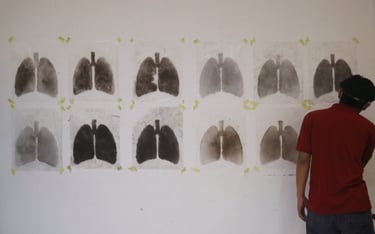 Domestic and street dusts were filtered with lab-grade shifter to expose the fine particles, and shaped into human lungs.